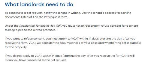 若房东想要拒绝租客养宠物,必须在14天内向VCAT申请禁令。